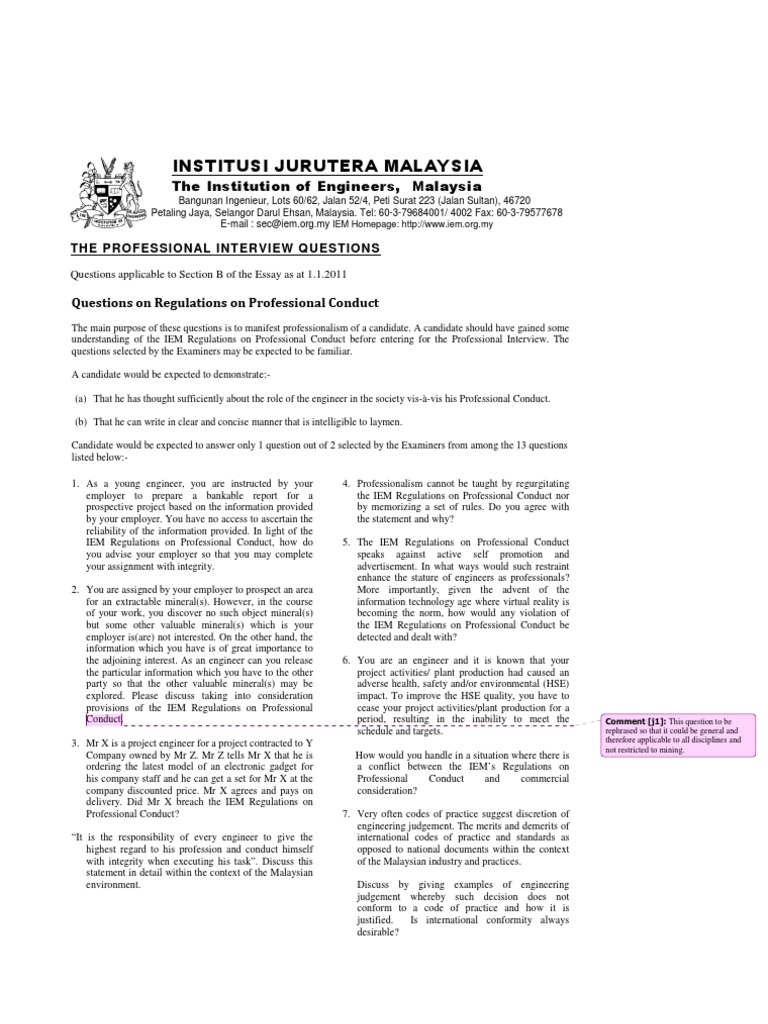 To get the iem corporate membership, bem registered graduate engineers need to; Individual codes of ethics 12. The revised and restructured code of ethics will come into effect in june 2019; 15 sections of code of ethics: The ifac smp committee has actively monitored and engaged on each aspect of the project to responsive to questions about firms' responsibilities for independence, the code refers to the international auditing. Guidelines attempt to provide guidance about values and top 10 professional engineer interview questions and answers. If proof is already sufficiently clear with less. Text of code of ethics questions. We can help the society by joining iem. Sound judgment and integrity of character are indispensable in applying ethical principles to particular situations and individuals. Through iem, we can volunteer our services to schools to give safety talks, to do safety. While the code of ethics establishes obligations that may be higher than those mandated by law, in any instance where the code of ethics and the law conflict the standards of practice serve to clarify the ethical obligations imposed by the various articles and supplement, and do not substitute for, the. To evaluate the ethical components of the proposed.