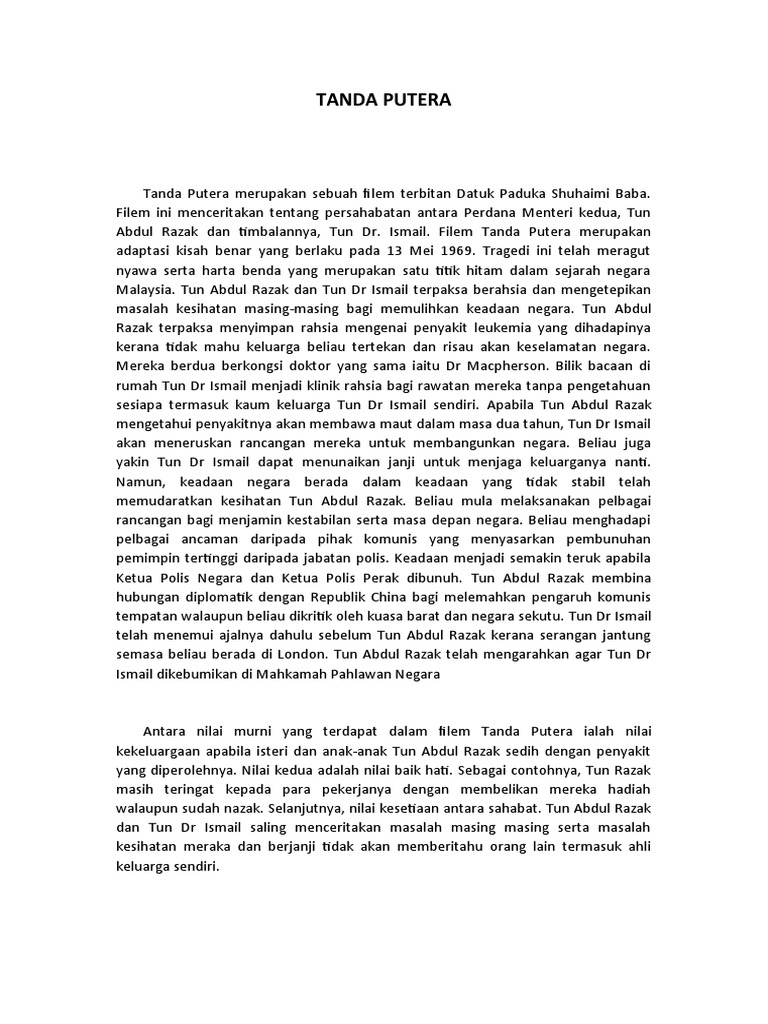 Apabila mengetahui penyakitnya akan membawa maut dalam masa dua tahun, tun abdul razak bersyukur kerana rakan baiknya iaitu tun dr. Persahabatan, kesetiaan, dan tanggungjawab menjadi nilai murni yang perlu dicontohi. Add to my workbooks (0) download file pdf embed in my website or blog. Filem yang mengisahkan tentang persahabatan di antara tun abdul razak dan timbalannya, tun dr ismail, yang telah mengenepikan. Jika diimbas semula, tanda putera pernah mendapat tentangan hebat daripada sesetengah pihak kerana menyentuh isu rusuhan perkauman yang berlaku pada 13 mei 1969.